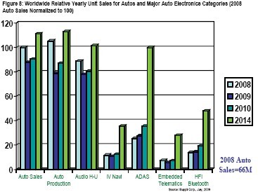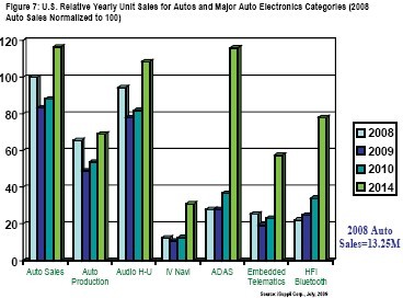 美國汽車生產(chǎn)遠(yuǎn)遠(yuǎn)落后于銷售,因?yàn)樵诿绹N售的客車有很大一部分是在加拿大、墨西哥、歐洲和亞洲生產(chǎn)的。該圖還顯示汽車音響本體、車載導(dǎo)航、ADAS、嵌入遠(yuǎn)程信息通訊和藍(lán)牙免提接口(HFI)電子的相對銷售情況。每個類別的銷售情況相近,都是在2009年下降,隨后幾年增長。只有藍(lán)牙HFI系統(tǒng)的銷售將在2009年上升,因?yàn)镕ord Sync和類似系統(tǒng)取得了成功。