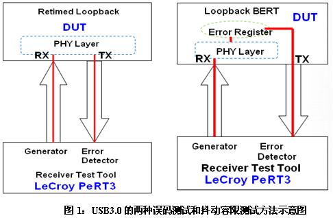 對于USB3.0的接收機(jī)測試還可以使用另一種方法:即Loopback BERT Method。如下圖1的右圖所示:DUT的接收端工作在Loopback BERT模式,直接分析BERT發(fā)送出的已知的測試碼流,對接收到的誤碼計(jì)數(shù),誤碼數(shù)量存入誤碼寄存器(如下圖1的Error Register),LeCroy PeRT3直接讀取誤碼寄存器,得到誤碼率和抖動容限測試結(jié)果。