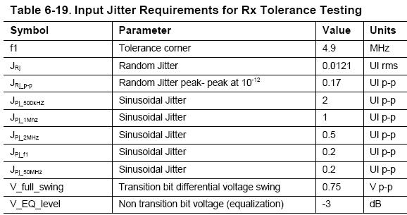 推薦的測試碼流是擾碼后的D0.0,對于USB3.0的誤碼率為 測試,一次需要大概10分鐘,而規(guī)范要求測量加入5個頻率正弦抖動時的誤碼,所以完成5個頻點(diǎn)的測試需要50分鐘,非常耗時。為了加快測試與驗(yàn)證速度,在USB3.0 Electrical Compliance Methodology White Paper, Revision 0.5中提出一種快速測量接收機(jī)BER的方法,即加大各頻點(diǎn)的固有抖動數(shù)值后,只測量到誤碼率= ,這樣只需30秒即可完成5個頻點(diǎn)的抖動容限測試。如圖4所示為誤碼率= 的抖動容限測試參數(shù)。