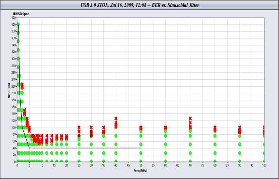 力科PeRT3可以自動測量多個頻點(diǎn)下的抖動容限和誤碼率,如下圖5所示為某USB3.0芯片的抖動容限測試結(jié)果,橫軸為頻率,縱軸為該頻點(diǎn)的抖動幅度,黑線為USB3.0規(guī)范要求的抖動容限,紅點(diǎn)為出現(xiàn)誤碼的正弦抖動的幅度,由于紅點(diǎn)都在黑線之上,說明該芯片接收端的抖動容限滿足規(guī)范要求。