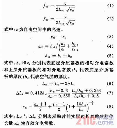 1.2雙層微帶天線的理論分析具體的推導步驟如下,假設下層貼片的諧振頻率為f01,邊長為Le1,上層貼片的諧振頻率為f02,邊長為Le2,有: