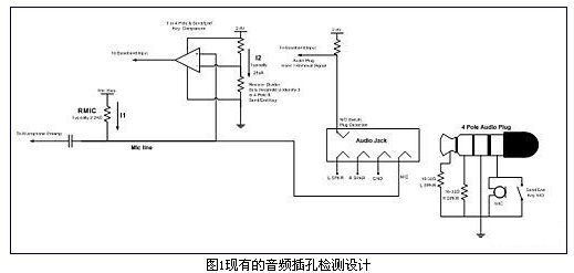 現有的音頻插孔檢測解決方案采用分立式元件設計,一般是比較器和相應的電阻和電容 (見圖 1)。這種設計存在一些固有缺陷,而這些缺陷會導致電流浪費及音頻雜音等用戶接口問題。電路中的比較器作用有二:一是在3極(立體聲耳機)或 4極(帶麥克風的耳機)音頻插頭之間進行檢測,二是檢測Send/End鍵的按壓。如果插入的是一個 3 極插頭,麥克風線被下拉到GND,比較器輸出一個Low信號給基帶。若連接4 極插頭,麥克風線通常為1.8V, 屬于不按壓Send/End鍵情況。按下Send/End鍵時,麥克風線對地短路,比較器輸出一個Low信號給基帶。這就帶來一個基本問題――如果連接4 極耳機,同時按下Send/End鍵,基帶記錄下3極插孔,系統可能永遠無法恢復。