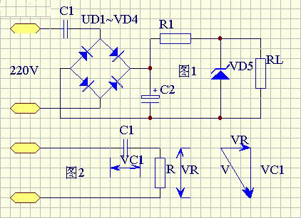 最簡單的電容降壓直流供電電路及其等效電路如圖1,C1為降壓電容,一般為0.33~3.3uF。假設C1=2uF,其容抗XCL=1/(2PI*fC1)=1592。由于整流管的導通電阻只有幾歐姆,穩壓管VS的動態電阻為10歐姆左右,限流電阻R1及負載電阻RL一般為100~200,而濾波電容一般為100uF~1000uF,其容抗非常小,可以忽略。若用R代表除C1以外所有元器件的等效電阻,可以畫出圖2的交流等效電路。同時滿足了XC1>R的條件,所以可以畫出電壓向量圖。
