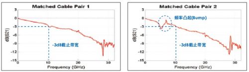 圖1,匹配電纜對的頻率響應,額定帶寬為18GHz。-3dB截止帶寬實際上大約為10GHz,低于額定帶寬。除此之外,兩條電纜的特性不相似,可能在部分信號內容過度衰減或放大時導致波形失真。特別是在第二條匹配電纜對上,可以在5GHz~8GHz之間看到頻率響應凸起