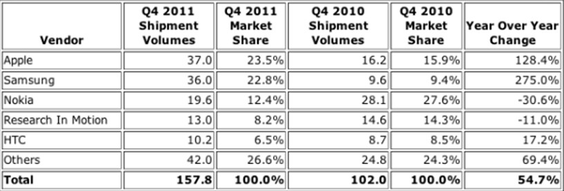- 2011年第4季度全球智能手機(jī)銷量同比增長了54.7%