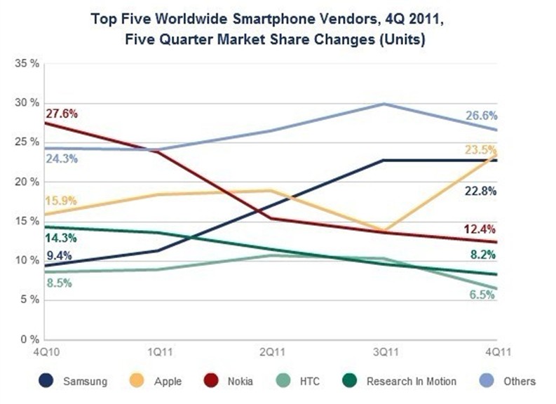2011年全球前五大手機(jī)廠商市場份額變化情況