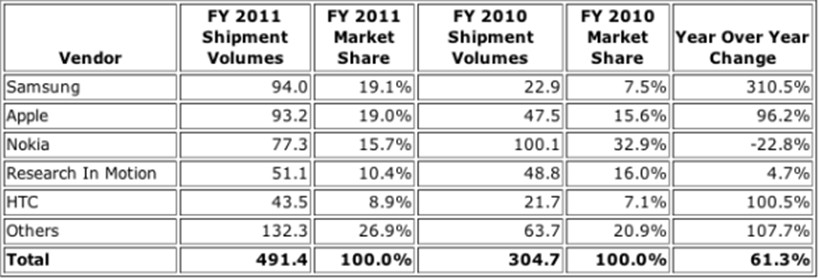 三星在第4季度完成了一系列重大的成就:首次突破了3000萬臺的銷量大關(guān),成為了各大智能手機(jī)企業(yè)同比增長最快的企業(yè),同時(shí)在2011年成為了智能手機(jī)整體市場的領(lǐng)頭羊。其Galaxy系列智能手機(jī)的市場份額進(jìn)一步擴(kuò)展,先后推出了針對高端市場的Galaxy S II和Galaxy Nexus,以及針對大眾市場的Galaxy Ace以及Galaxy Y等。同時(shí)該公司還在Windows Phone Mango的基礎(chǔ)上更新了其Omnia和Focus等產(chǎn)品。