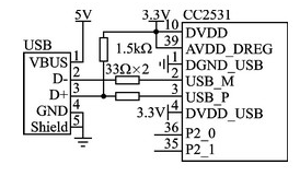 CC2531的USB硬件連接很簡(jiǎn)單,如圖3所示。采用USB總線供電方式,通過電壓轉(zhuǎn)換芯片AM11173.3為硬件電路提供3.3 V電壓(圖中未畫出)。由于該設(shè)備為全速設(shè)備,因此D+信號(hào)線通過電阻上拉。