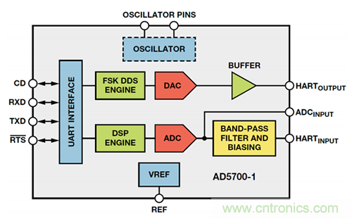 圖 2 中顯示的其他三個模塊是上文提及的UART接口、內部基準和振蕩器。RTS和TXD是用于調制的重要信號,而CD和RXD則對解調非常重要。AD5700 可以接收外部 2.5 V基準,只有在AVDD電源大于 2.7 V時才能使用。對內部或外部基準選項的使用受REF_SEL針腳的極性控制。對于時鐘,該器件支持多個方案,以實現簡單的低成本可配置解決方案。AD5700 可以使用外部晶體、陶瓷諧振器或CMOS輸入。AD5700-1 是首款集成內部低功耗 0.5%精密振蕩器的HART調制解調器IC,降低了所需的外部電路以及總體成本。眾多片上集成功能顯著簡化了HART兼容系統的設計,從而提供更加可靠和經濟高效的穩定網絡解決方案。