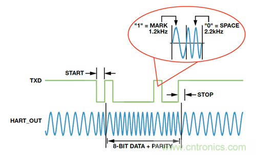 圖 2 顯示了調制涉及的主要模塊:FSK直接數字合成 (DDS)引擎、DAC(開關電阻串類型)和緩沖區。要發送的數字數據通過UART輸入。調制器通過將RTS(請求發送)信號拉低來使能。調制器將TXD輸入端的UART編碼HART數據位流轉換成一系列二進制 1200 Hz(“1”)和 2200 Hz(“0”)信號音(見圖 3)。DDS在任何一種頻率下生成正弦數字字流,DAC將其轉換為大約 493 mV的p-p模擬正弦波。此正弦波信號在內部進行緩沖并在HART_OUT引腳上輸出。該DDS引擎本身會產生連續相位信號,因此在頻率之間切換時避免了出現任何輸出不連續。在HART_OUT上進行內部緩沖的主要優勢是產生很高的驅動能力,無需外部模擬緩沖,也不會出現它們帶來的問題。HART_OUT引腳直流偏置至 0.75 V,并應容性耦合至負載。有關更多詳細信息,請參見AD5700/AD5700-1 數據手冊。