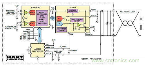 低功耗非常重要,因為環路供電的所有電路的功耗必須低于3.5 mA。圖 4 顯示了環路中的 HART 通信應用示例。在 AD5700控制板上,AD5700 HART 調制解調器與 AD5421 16 位串行輸入環路供電型 4 mA 至 20 mA DAC 和 ADuCM360 微控制器接口連接,以演示用于測量壓力(“0”)和溫度(“1”)的兩個共享數據通道的環路供電型發射器電路。