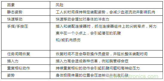 了解并記錄操作員執行的任務順序,有助于識別相關人機工程學風險。例如,連接器操作員需要手腕和手指用力才能將插座連接器和插頭連接器壓在一起。對鎖扣連接器的高頻操作可能引起手腕綜合癥(CTS)。