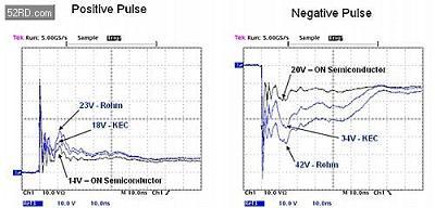 從圖3所示的圖上可見(jiàn),顯然,與兩個(gè)競(jìng)爭(zhēng)對(duì)手的器件(藍(lán)色波形)相比較,安森美半導(dǎo)體保護(hù)解決方案(黑色波形)可提供更低的ESD脈沖箝位電壓。與KEC的18V和Rohm的23V相比較,安森美的器件將正脈沖箝位在14V。而在負(fù)脈沖期間,這三個(gè)器件之間箝位電壓的差異更加明顯。安森美、競(jìng)爭(zhēng)對(duì)手2和競(jìng)爭(zhēng)對(duì)手1的器件對(duì)負(fù)脈沖的箝位電壓分別是20V、34V和42V。