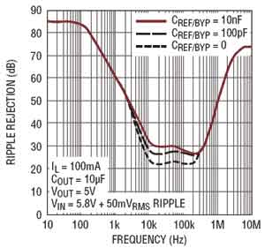 LT3050能有效地將天線電源與12V電源線上的噪聲或者來自某個中間降壓型穩壓器的噪聲隔離開來(見圖4)。單個電容器提供了基準軟起動和噪聲旁路功能,從而實現了一個可編程啟動時間和超低噪聲操作。