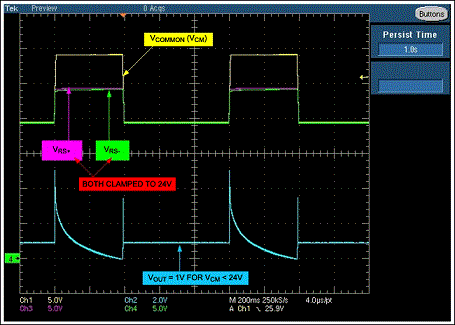 圖2是當移走D1時,35V拋負載脈沖下放大器的輸出。施加電壓為電池標稱電壓,所要求的輸出電壓為1V(輸入VSENSE=50mV、增益=20)。出現(xiàn)拋負載電壓時,齊納管把輸入共模電壓鉗位在大約24V,放大器輸出經(jīng)過幾個短暫的波動后穩(wěn)定到0V。