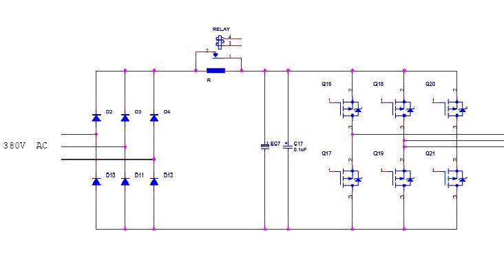 大家可以看出圖上標出15KW的地方,就是我們的繼電器應用的地方,一般在15KW以下的變頻器上的保護工作都是由繼電器來完成的,大于15KW的變頻器都是用接觸器來保護的,繼電器主要完成的作用為,大家知道當電機啟動會有一個很大的沖擊電流,為了對變頻器進行保護,先用繼電器把這個大的沖擊電流擋住,也就是繼電器處于常開狀態,等電流恢復到正常,繼電器關閉,把那個電阻短路,所以此處的繼電器一般都是需要電流比較大的,例如omron的G8P型繼電器,由于此處繼電器對電機有比較重要的作用,所以一般客戶都會選擇質量較好的繼電器,有用OEG的,有泰科的,也有松川的。如果在15KW以上的變頻器,一般客戶不會選擇用繼電器來保護,由于沖擊電流太大,一般客戶會選擇接觸器來保護,但是接觸器的價格要比繼電器貴的多。還有一個地方,就是變頻器上都會有給客戶留的無源觸點,這個地方會用繼電器當開關使用。