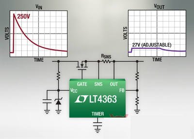 近日,凌力爾特公司推出過(guò)壓保護(hù)控制器 LT4363,該器件為高可用性電子系統(tǒng)提供了過(guò)壓和過(guò)流保護(hù)。當(dāng)流過(guò)長(zhǎng)電感性電源總線的電流突然變化時(shí),就會(huì)發(fā)生電源電壓浪涌。另外,汽車(chē)電池還會(huì)經(jīng)歷一種稱(chēng)為負(fù)載突降的情況,在這種情況下,電壓會(huì)在持續(xù)多個(gè) ms 的時(shí)間里處于上升狀態(tài)。傳統(tǒng)的保護(hù)電路依靠笨重的電感器、電容器、保險(xiǎn)絲和瞬態(tài)電壓抑制器。而 LT4363 通過(guò)簡(jiǎn)單地控制一個(gè) N 溝道 MOSFET,實(shí)現(xiàn)了可靠、自適應(yīng)和節(jié)省空間的設(shè)計(jì)。只有控制器和 MOSFET 經(jīng)受高壓浪涌,下游組件可以提供較低電壓的額定值,因此節(jié)省了成本。