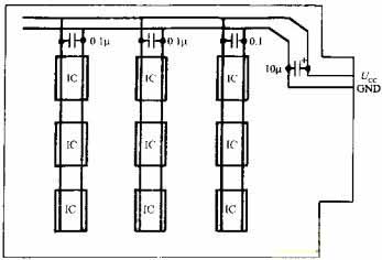 在單片機(jī)測控系統(tǒng)中使用了大量的數(shù)字IC,而每片數(shù)字IC本身都是一個脈沖干擾源,它們也會通過電源線相互干擾。解決辦法是在印制板電源進(jìn)線端并聯(lián)一只10UF~100UF鉭電容進(jìn)行電源退耦,同時在每個芯片的電源進(jìn)線端再并聯(lián)一只高頻、低分布的電感的陶瓷電容,容量一般取0.1UF,當(dāng)頻率超過15MHZ時,可取0.01JF,電路如圖所示。退耦電容的引腳要盡量短。