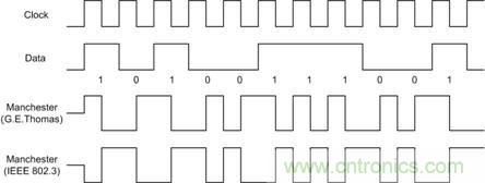 數(shù)字編碼采用曼徹斯特編碼,首先傳輸MSB(最高有效位)。曼徹斯特編碼:從高位轉(zhuǎn)移到低位(下降沿)為二進(jìn)制1,從低位轉(zhuǎn)移到高位(上升沿)為二進(jìn)制0,即圖 1的Manchester G.E.Thomas。