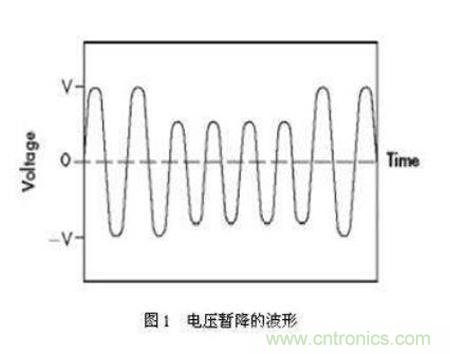 電壓暫降就是電壓突然降低,但是在很短時間內又恢復正常,如圖1 所示,電壓暫降與電壓過低的區別是電壓暫降的時間很短,但是降低的幅度很大,有時暫降后的電壓僅為正常電壓的10%。