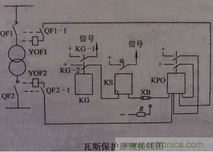 變壓器瓦斯保護的主要元件就是瓦斯繼電器,它安裝在油箱與油枕之間的連接管中。當變壓器發生內部故障時,因油的膨脹和所產生的瓦斯氣體沿連接管經瓦斯繼電器向油枕中流動。若流動的速度達到一定值時,瓦斯繼電器內部的擋板被沖動,并向一方傾斜,使瓦斯繼電器的觸點閉合,接通跳閘回路或發出信號,如圖所示:瓦斯繼電器KG的上觸點接至信號,為輕瓦斯保護;下觸點為重瓦斯保護,經信號繼電器KS、連接片XE起動出口中間繼電器KOM,KOM的兩對觸點閉合后,分別使斷路器QF1、QF2、跳閘線圈勵磁。跳開變壓器兩側斷路器,即: