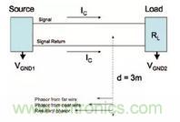 圖1:電路回路中的共模電流。電路中的源是一個(gè)數(shù)字信號(hào)(帶諧波),其負(fù)載被假定為阻性。因?yàn)檫h(yuǎn)端導(dǎo)線(xiàn)上的相電流和近端導(dǎo)線(xiàn)上的相電流的流向是相同的,所以其合成相量相較于差模電流產(chǎn)生的相量會(huì)更大。在這種情況下,為了限制輻射發(fā)射的水平,降低諧波成分的大小(減慢數(shù)字信號(hào)的上升/下降時(shí)間)或者轉(zhuǎn)移/限制共模電流是非常重要的。