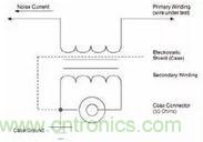 射頻電流探頭是一個(gè)初級(jí)類(lèi)型為插入式的射頻電流變壓器。即,當(dāng)我們將探頭夾在待測(cè)電流流經(jīng)的導(dǎo)線(xiàn)或者電纜上的時(shí)候,這些導(dǎo)體就構(gòu)成了變壓器的初級(jí)線(xiàn)圈。這種探頭的夾合特性使得它很容易被安置在任意導(dǎo)體或者電纜的四周。其本質(zhì)就是一個(gè)寬帶的高頻變壓器。利用電流探頭,可以在不對(duì)電路造成物理影響的情況下,實(shí)現(xiàn)對(duì)電纜上的高頻電流的測(cè)量。既然打算將電流探頭夾合在導(dǎo)線(xiàn)上,那么如圖2 所示的變壓器初級(jí)實(shí)際上就是待測(cè)共模電流流過(guò)的電導(dǎo)體本身。另外,因?yàn)楣材k娏鞅徽J(rèn)為是流過(guò)導(dǎo)體后,再經(jīng)過(guò)回流導(dǎo)體(例如:框架,共地面或者接地)返回到電源的,所以這個(gè)變壓器的初級(jí)線(xiàn)圈通常被認(rèn)為只有一匝。在某些電流探頭的模型中,次級(jí)輸出端內(nèi)部接的是阻性負(fù)載,這樣可以在一個(gè)很寬的頻率范圍內(nèi)提供非常穩(wěn)定的轉(zhuǎn)移阻抗。