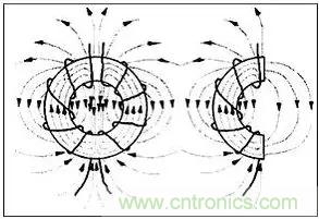 磁芯的作用就好象它在線圈繞組的間隙處裂為兩半時所表現(xiàn)出來的效果一樣。每個繞組在環(huán)形線圈一半的區(qū)域內(nèi)產(chǎn)生磁場,意指穿過空氣的磁場必定會形成自封閉回路,下圖是環(huán)形磁芯和差模電流磁路的示意圖。