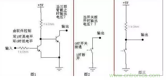 圖3中那個(gè)1k的電阻即是上拉電阻。如果開關(guān)閉合,則有電流從1k電阻及開關(guān)上流過,但由于開關(guān)閉和時(shí)電阻為0(方便我們的討論,實(shí)際情況中開關(guān)電阻不為0,另外對(duì)于三極管還存在飽和壓降),所以在開關(guān)上的電壓為0,即輸出電平為0。如果開關(guān)斷開,則由于開關(guān)電阻為無窮大(同上,不考慮實(shí)際中的漏電流),所以流過的電流為0,因此在1k電阻上的壓降也為0,所以輸出端的電壓就是5v了,這樣就能輸出高電平了。