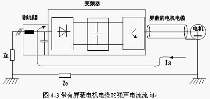 使用屏蔽電機(jī)電纜:對于高頻干擾,如果高次諧波干擾電流Is有一條合理的通道,則高頻干擾是可以得到抑制的。如果使用非屏蔽電纜,則高次干擾諧波電流Is以一個(gè)不確定的路線流回變頻器,并在此回路中產(chǎn)生高頻分量壓降,影響干擾其它設(shè)備。為使高次諧波干擾電流Is能沿確定路線流回變頻器,需要采用屏蔽電機(jī)電纜(如圖4-3所示)。電纜屏蔽層必須連接到變頻器外殼和電機(jī)外殼上,當(dāng)高次諧波干擾電流Is必須回變頻器時(shí),屏蔽層形成一條有效的通道。這樣,高次諧波干擾電流就不會在Ze上產(chǎn)生壓降,在Zn上的壓降可由進(jìn)線電抗干擾濾波器來抑制(如圖4-2中的F12)。