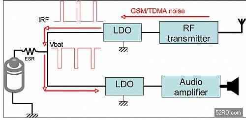 防止GSM噪聲降低音頻質(zhì)量的最佳方法,就是使用具有很低壓降(LDO)和低輸出噪聲的線性穩(wěn)壓器(LR)從鋰離子電池直接給音頻放大器供電。這種LDO線性穩(wěn)壓器用作放大器電源的“清理”或?yàn)V波模塊。