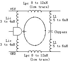 圖5為電流環(huán)的模型。從電流環(huán)模型中我們可以看出,環(huán)路中存在寄生電感,它們在高頻狀態(tài)下表現(xiàn)為環(huán)路的阻抗可導致供給電源產(chǎn)生尖峰,并會輻射電磁波從而干擾系統(tǒng)的其他部分。環(huán)路中Ll為電容管腳引線的封裝電感;Lpc為電容管腳到器件電源或者地管腳之間的PCB傳輸線的寄生電感;Lic為器件管腳引線的寄生電感。另外,在前面我們討論過電容本身也是具有寄生電感ESL的。這樣回路的總電感為:L=2Ll+2Lpc+2Lic+ESL。由于環(huán)路的寄生電感將會給整個系統(tǒng)帶來電磁干擾,產(chǎn)生電壓尖峰,這個電壓尖峰值同串聯(lián)電感之間存在一定的關(guān)系,近似計算公式如下: