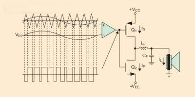 由于自身的效率很高,D類音頻放大器很快就在消費電子設備中獲得了廣泛的應用。D類音頻放大器通過輸入的模擬信號來調制一個高頻方波,該方波的頻率可以是固定的也可以是可變的,甚至可以是隨機脈沖。低通濾波器用來過濾信號中的高頻內容以及恢復原始音頻信號。在沒有濾波器的拓樸中,揚聲器本身的電感會被合并成濾波器的一部份。脈沖寬度調制(PWM)是一種普遍的D類拓樸技術,它采用固定頻率的波形,并通過改變工作周期在低通濾波器后面產生出一個移動平均信號(圖4)。