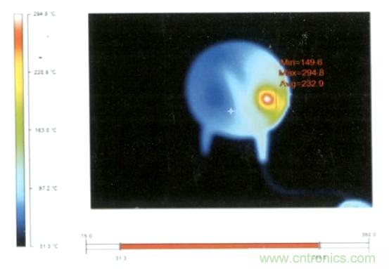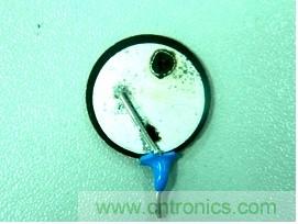 這種壓敏電阻通過擊穿點進行電流泄放,在泄流點會形成大量的熱量,這種熱量最終會導(dǎo)致壓敏電阻燒穿(見下圖)。