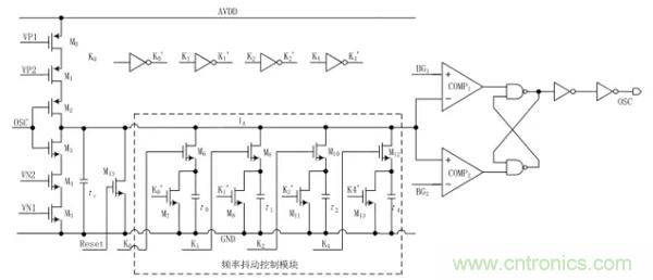 由圖1可以看出,頻率抖動(dòng)振蕩器由一個(gè)張弛振蕩器加上一個(gè)頻率抖動(dòng)模塊構(gòu)成。其工作原理:首先,開關(guān) S1閉合,電流源 I0給電容 Cc充電,充電剛開始時(shí)電容 Cc上極板的電壓小于 BG1和 BG2,RS 觸發(fā)器的輸出被置為低電平 0,當(dāng)電容上極板電壓 VA大于 BG2時(shí),RS 觸發(fā)器的輸出狀態(tài)處于保持狀態(tài),直到上極板電壓 VA大于 BG1之后 RS 觸發(fā)器的輸出翻轉(zhuǎn)被置為高電平1;此時(shí),開關(guān) S2導(dǎo)通,電流源 I1給電容Cc放電,當(dāng)VA減小到小于 BG1時(shí),RS 觸發(fā)器的輸出處于保持狀態(tài),當(dāng)VA減小到小于 BG2時(shí),RS 觸發(fā)器翻轉(zhuǎn)被置為低電平 0 ;于是,開關(guān) S1又閉合開始對(duì) Cc充電,如此周而復(fù)始,得到一個(gè)頻率固定的振蕩器。圖1中的電流源I0、 I1的電流相等,則振蕩器的占空比為 0.5。頻率抖動(dòng)控制模塊是通過計(jì)數(shù)器來周期性的切換加入到張弛振蕩器中充放電電容的大小,改變電壓 VA的充放電速度,從而來達(dá)到周期性的改變振蕩器頻率的目的,即實(shí)現(xiàn)了振蕩器頻率的抖動(dòng)。