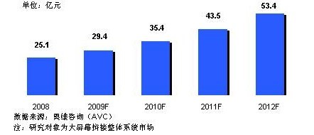 - 2008年中國大屏幕市場規(guī)模約為25.1億元,預(yù)計(jì)2009年將增長17%左右,市場規(guī)模將達(dá)29.4億元