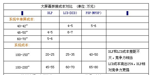 從總體系統(tǒng)分析,100-150”系統(tǒng)中,DLP平均成本為20~25萬元左右,而LCD和DLP的差距已經(jīng)縮小到10萬元以內(nèi),成本競爭力基本相當(dāng)。在150”以上超大拼接系統(tǒng)中,LCD的成本要高出DLP大約25-30%,而MPDP更是要高出30%以上,這一領(lǐng)域DLP的成本競爭力優(yōu)勢(shì)比較明顯。