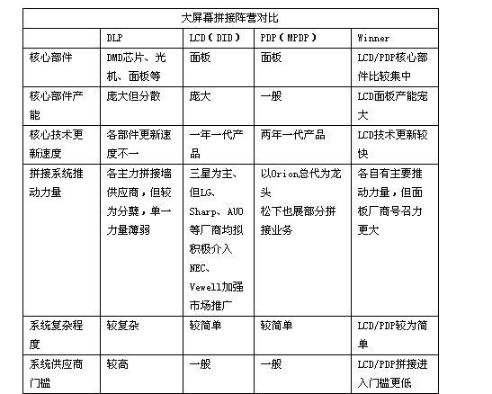 以LCD/PDP為代表的平板產(chǎn)業(yè)鏈卻有著規(guī)模龐大且集中度高的特點(diǎn),面板廠商作為整個(gè)產(chǎn)業(yè)的主要驅(qū)動(dòng)力量,很好的扮演了大屏幕拼接技術(shù)和市場推廣者的角色。雖然暫時(shí)只有Samsung作為主力推動(dòng)DID LCD拼接技術(shù)的力量,但是包括LG、Sharp、CMO、AUO等在內(nèi)全球主力面板廠商都已開始積極布局專業(yè)公共顯示面板及拼接顯示面板。LCD產(chǎn)業(yè)由于可以橫跨零售、商用、大屏幕拼接等諸多領(lǐng)域,規(guī)模更大,系統(tǒng)效率也更高一些。