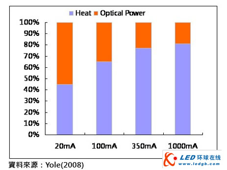 LED發光效率除了影響到光通量輸出,以及耗能外,「熱」另外一個重要關鍵,以目前普遍商品化LED發光效率分析(如圖五),1W高功率LED發光效率約在70lm/W左右,其中有77%能量以熱的型態表現出來,僅有23%能量以光的型態表現出來,當輸入功率愈高,產生的熱愈多,因此需要更多的散熱組件,導致LED成本提高、可靠度降低,若能提高LED發光效率,LED散熱問題自然可以解決。