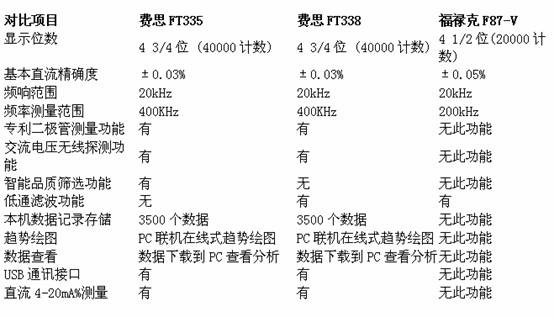 以Faith費思的工業用真有效值萬用表FT330系列和美國福祿克的工業用萬用表F87-V一比較就可以看出國產品牌的優勢: