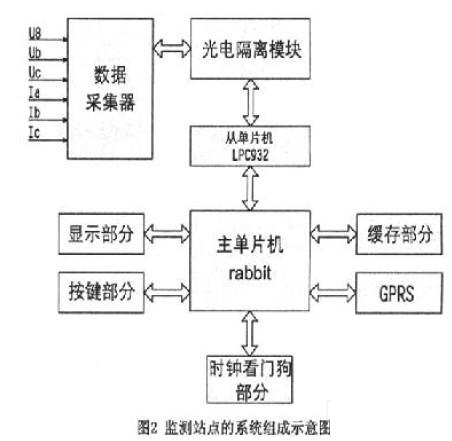 監測站點由前端數據采集器和現場下位機構成,其中前端數據采集器采用CS5460模塊和LPC932單片機構成,它負責采集監控現場的各項數據并存儲。線路的內部經過嚴格的電磁隔離,測量電路經過采樣、A/D轉換處理后形成的數字信號再經過光電耦合由信號適配器向從單片機LPC932傳送,主單片機與從單片機之間可采用I/O口模擬時序的方式進行串口通信。