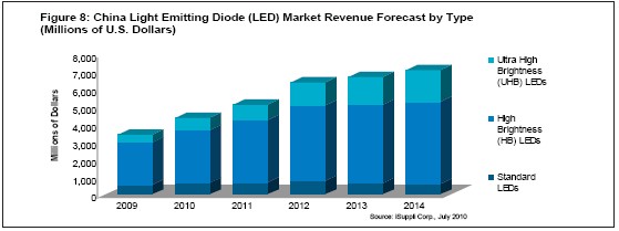另外,憑借政府的支持和LED日益進入液晶電視及普通照明等新的應用領域,iSuppli公司預測,2014年中國LED營業收入將達到71億美元,而2009年是34億美元,其間的復合年度增長率為12.8%。超高亮度(UHB)LED的增長速度更快,到2014年銷售額將從2010年的6.86億美元上升到18億美元,復合年度增長率為26.9%。