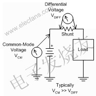 負(fù)載或電源的低壓側(cè)或高壓側(cè)都可進(jìn)行電流檢測。共模電壓是指分路(shunt)上的電壓(不是分路上的差分電壓),在低壓側(cè)檢測為零伏。低壓側(cè)檢測最簡單,可采用最基本的放大器電路。低壓側(cè)檢測的難點(diǎn)在于:低壓側(cè)檢測會影響系統(tǒng)的接地端,可能還需要增加更多的線路,而且這種作法通常不利于故障診斷。圖1中的高壓側(cè)分路放大器可檢測很高的電源電壓上極低的差分電壓(通常為100mV或更低),通常在車載應(yīng)用中為13.8V。不過,如果為無限制的(unconditioned)電池線路,那么會受瞬變影響:如果無意中將電池方向放錯就會出現(xiàn)–13.5V的情況,如果出現(xiàn)負(fù)載突降或感應(yīng)反沖,那么最大瞬變可達(dá)72V。不妨設(shè)想,放大器通常采用5~12V的單電源供電(5V的電源供電日益常見),這就需要放大器的輸入引腳連接到共模電位,大大超過了放大器電源軌的限制。