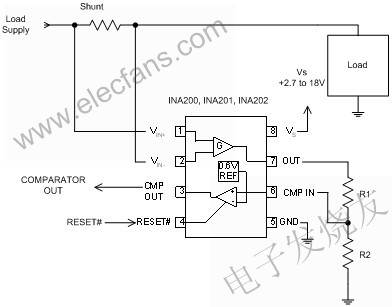 在許多應(yīng)用中,電流應(yīng)與某個設(shè)定值相比較。通常說來,進(jìn)行電流比較還需要電流分路監(jiān)控器、比較器和參考電壓。此外,理想的比較器輸出應(yīng)與大多數(shù)常見的邏輯電路很好地兼容。圖5給出了電流比較的例子。在本例中,將電流與采用TIINA200系列電流分路監(jiān)控器和比較器的簡單單電壓結(jié)點(diǎn)進(jìn)行了比較。R1和R2形成分壓器,以根據(jù)INA200系列比較器的內(nèi)置0.6V電壓結(jié)點(diǎn)來設(shè)置電壓結(jié)點(diǎn)。(INA200系列的增益很有特點(diǎn):INA200的增益為20,INA201的增益為50,INA202的增益為100。)