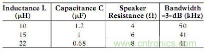 常見(jiàn)的濾波器設(shè)計(jì)選擇目的是為了在所需要的最高音頻頻率條件下將濾波器響應(yīng)下降減至最小以獲得最低帶寬。如果對(duì)于高達(dá)20 kHz頻率,要求下降小于1 dB,則要求典型的濾波器具有40 kHz巴特沃斯(Butterworth)響應(yīng)(以達(dá)到最大平坦通帶)。對(duì)于常見(jiàn)的揚(yáng)聲器阻抗以及標(biāo)準(zhǔn)的L值和C值,下表給出了標(biāo)稱元器件值及其相應(yīng)的近似Butterworth響應(yīng):