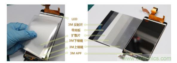 小編強大的產業鏈力量不是隨便說說的,這個背光模組里的光學膜材用的竟然都是那么貴滴的3M的光學增亮膜,這種增亮膜組合一般都是出現在高端手機里面的。上下兩張棱鏡膜幫助調整背光方向到人眼的觀看方向并提高屏幕軸向亮度。3M的APF多層膜可以幫助提升屏幕亮度,比無APF的屏幕提升40%以上。