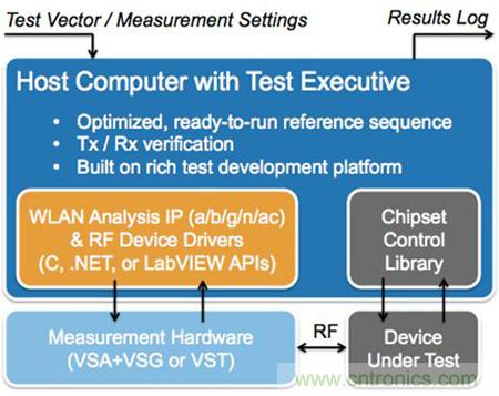 非信令測(cè)試還要求主機(jī)具有芯片組供應(yīng)商提供的芯片組控制庫(kù)才能在非信令模式下控制DUT。圖1顯示了這些組件如何構(gòu)成一個(gè)典型的WLAN非信令測(cè)試框架。