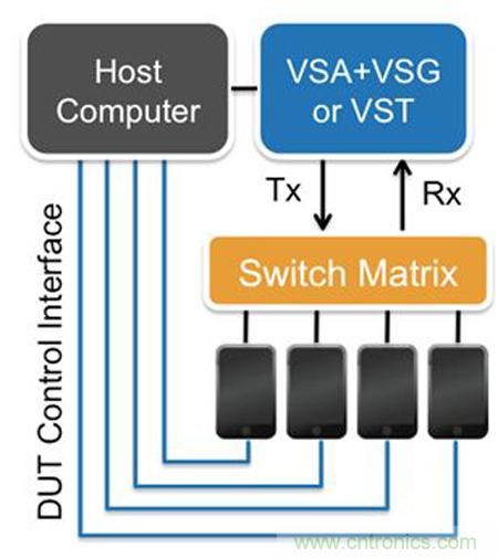 此類因素顯著增加了測(cè)試時(shí)間,繼而增加了測(cè)試成本。新的解決方案是芯片組供應(yīng)商、測(cè)試廠商以及最終用戶通過(guò)并行測(cè)試多臺(tái) 設(shè)備來(lái)最大限度提高效率,這一方法也稱為“多DUT”測(cè)試。通過(guò)利用最新的多DUT測(cè)試軟硬件架構(gòu),設(shè)備制造商可以顯著增加他們的生產(chǎn)測(cè)試吞吐量而不會(huì)增加測(cè)試成本。這里來(lái)研究和比較各種多DUT測(cè)試方案,其中圖2所示的方案是使用一個(gè)VSA+VSG或VST通過(guò)一個(gè)