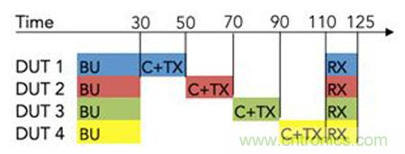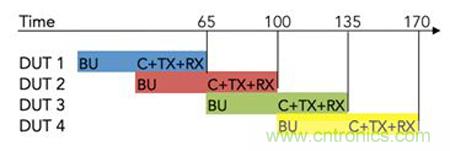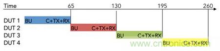 利用多線程并行軟件架構(gòu)和外部開關(guān)電路,已經(jīng)完成啟動(dòng)的DUT在執(zhí)行TX和RX測(cè)試時(shí),并行軟件線程可控驅(qū)動(dòng)下一個(gè)DUT的啟動(dòng)過(guò)程,從而實(shí)現(xiàn)測(cè)試的流水線執(zhí)行。這種方法減少了儀器的停機(jī)時(shí)間,縮短了高達(dá)35%的測(cè)試時(shí)間,如圖4所示。