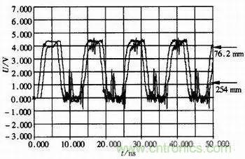 在高速數(shù)字電路的設(shè)計(jì)中,除了阻抗匹配外,部分器件對(duì)傳輸線的長(zhǎng)度有著嚴(yán)格的要求,信號(hào)頻率越高,要求傳輸線的長(zhǎng)度越短。以X1器件和X2器件為例建立仿真模型如圖3所示。在仿真模型中加了33Ω的匹配電阻,選擇仿真信號(hào)頻率為66MHz方波,改變傳輸線長(zhǎng)度分別為76.2mm和254mm時(shí)進(jìn)行仿真。仿真結(jié)果如圖4所示。